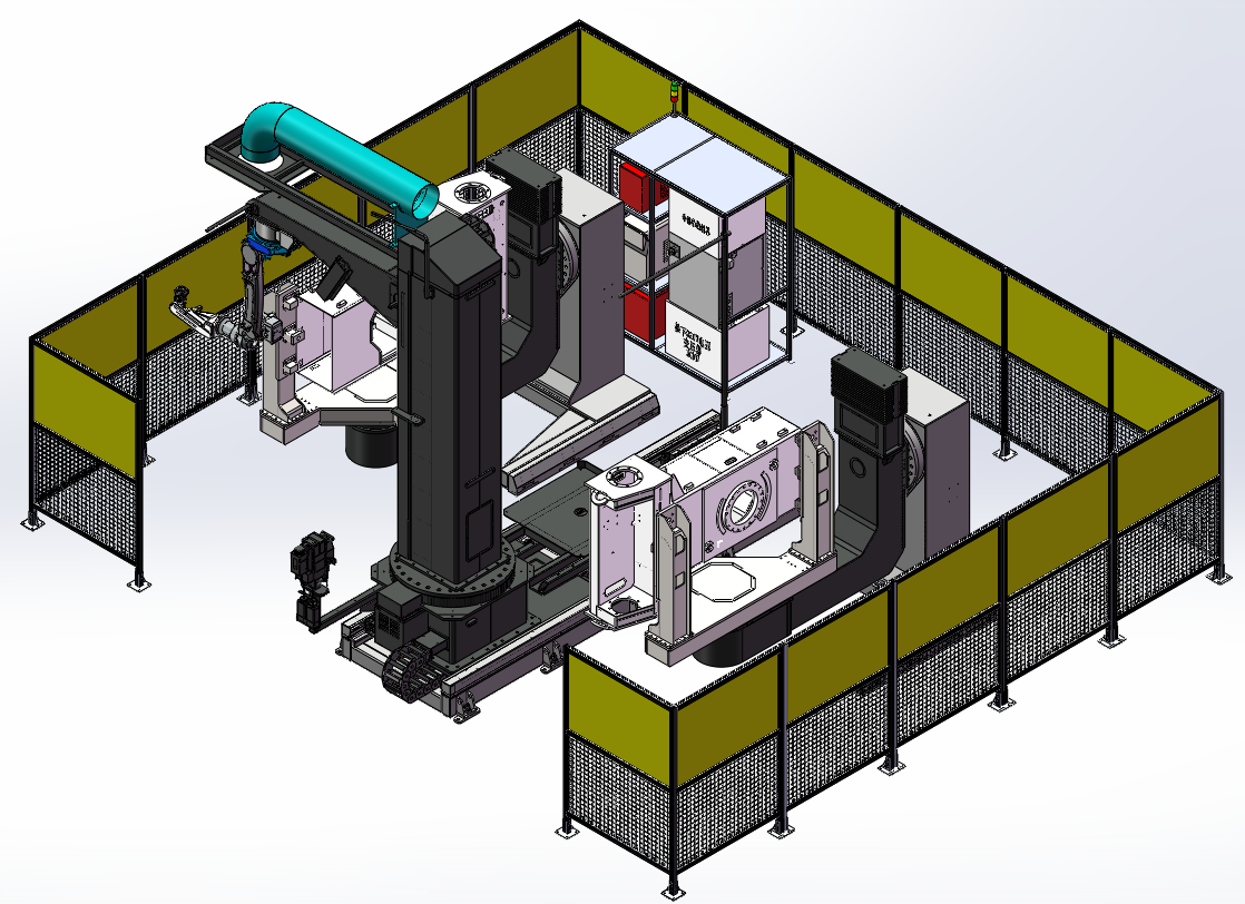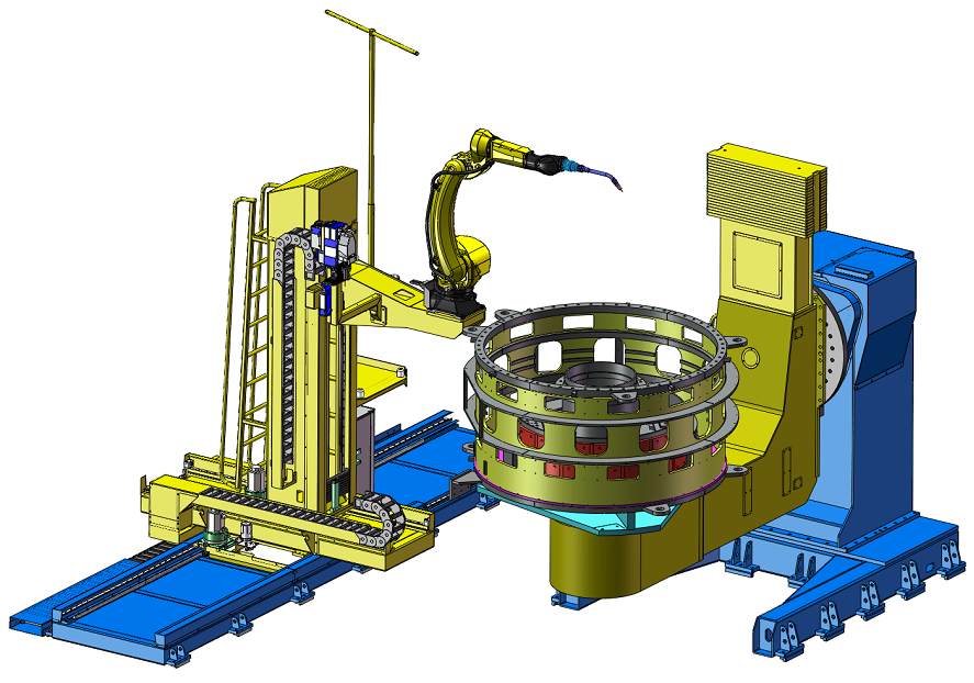 5機(jī)聯(lián)動(dòng)機(jī)器人焊接系統(tǒng);變位機(jī)承載能力達(dá)到1噸,適用于多型號(hào)動(dòng)臂斗桿結(jié)構(gòu)件的焊接;反變形及夾緊定位一體化設(shè)計(jì)伺服夾具,與工件自 動(dòng)化柔性輸送系統(tǒng)配合,可實(shí)現(xiàn)多種型號(hào)工件的自動(dòng)裝夾。