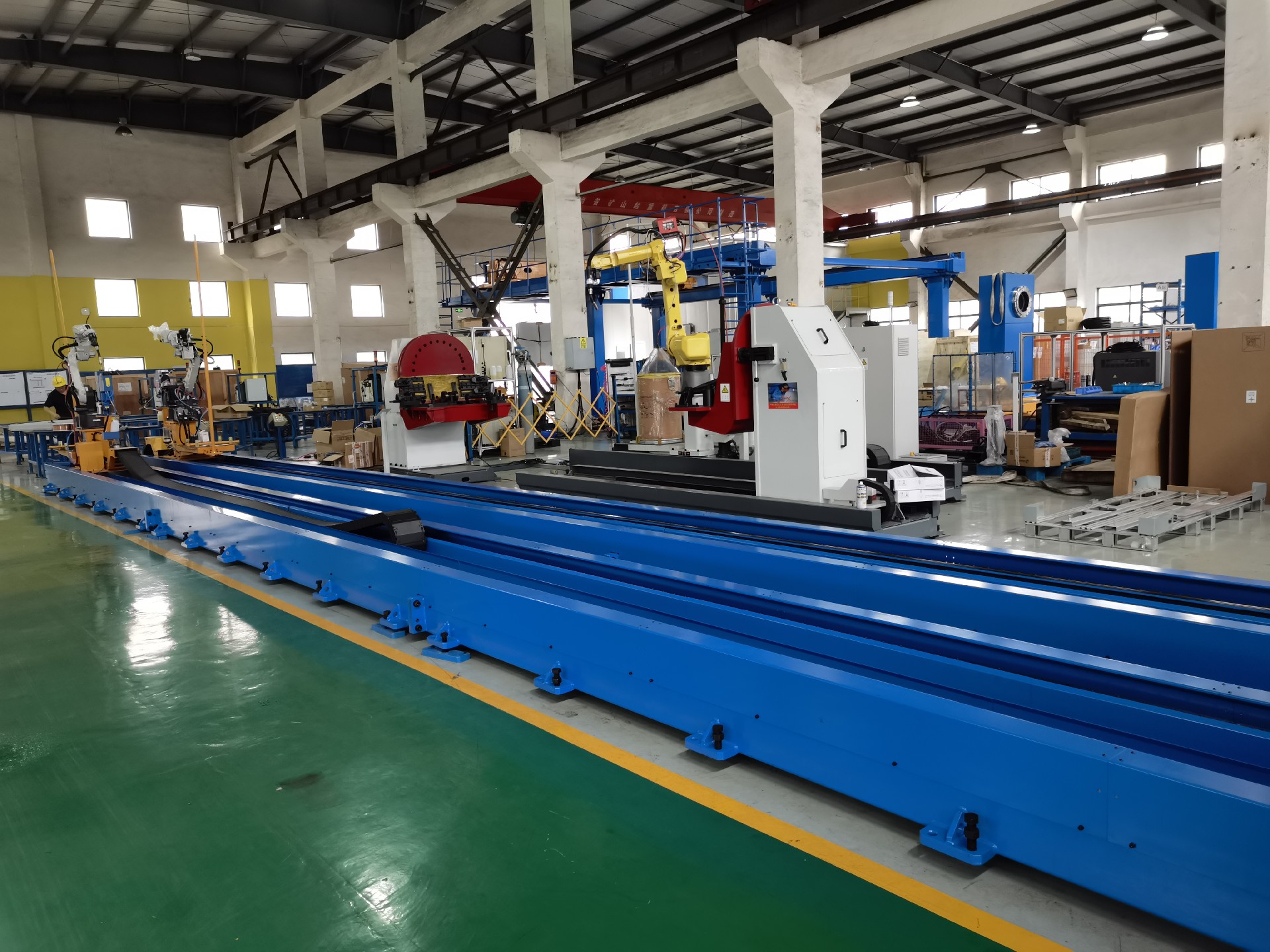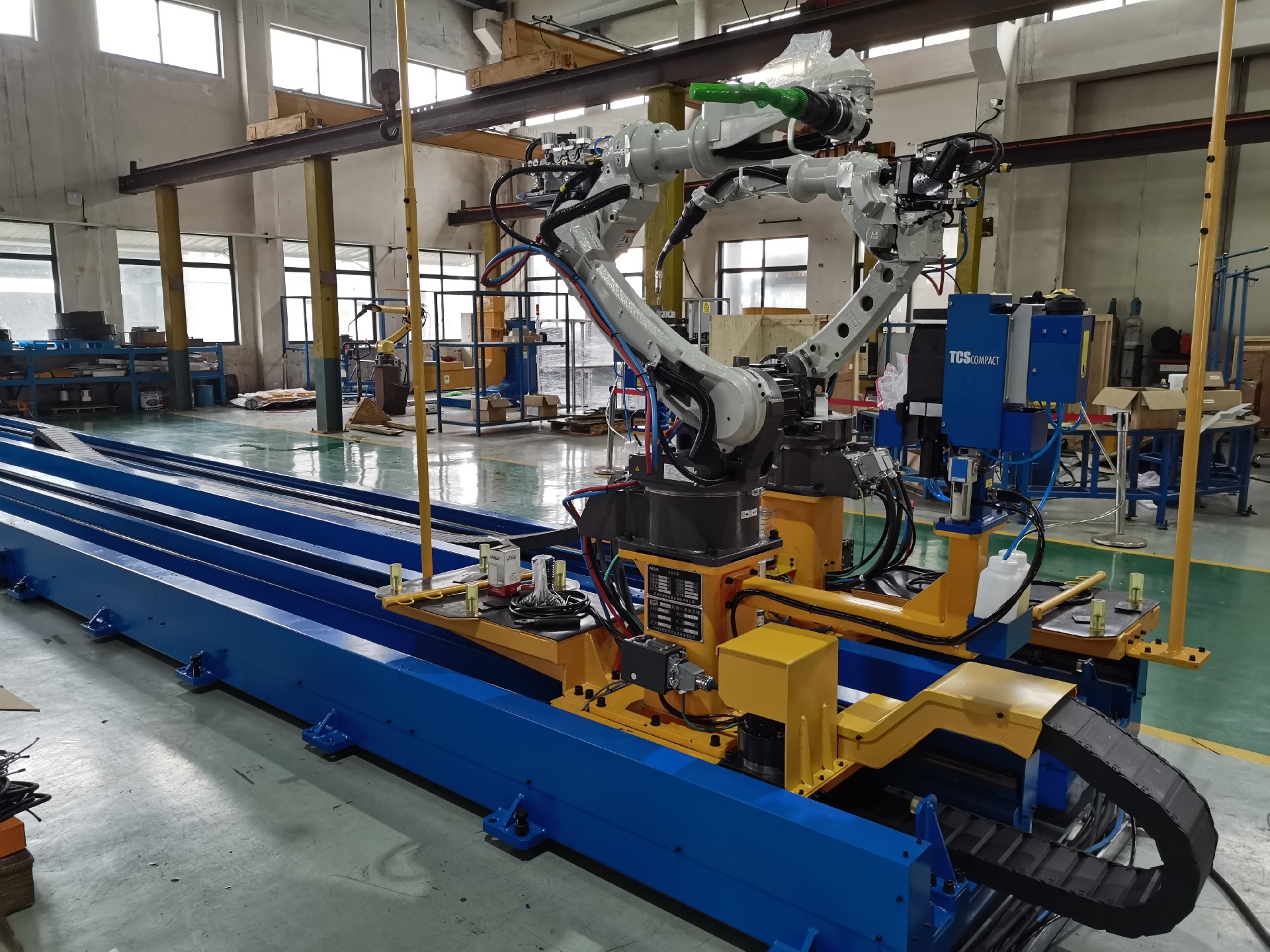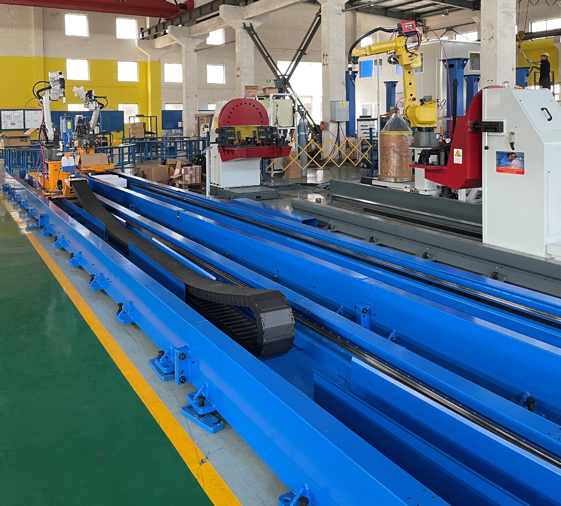 1.單軸16米機器人行走機構(gòu):機器人安裝在一軸行走機構(gòu)上,能夠在水平方向上自由移動長達16米的距離。這種設計使得機器人能夠覆蓋更大的工作區(qū)域,從而提高焊接的可達性和靈活性。這對于處理大型或長條形的工業(yè)爐水梁特別有用。