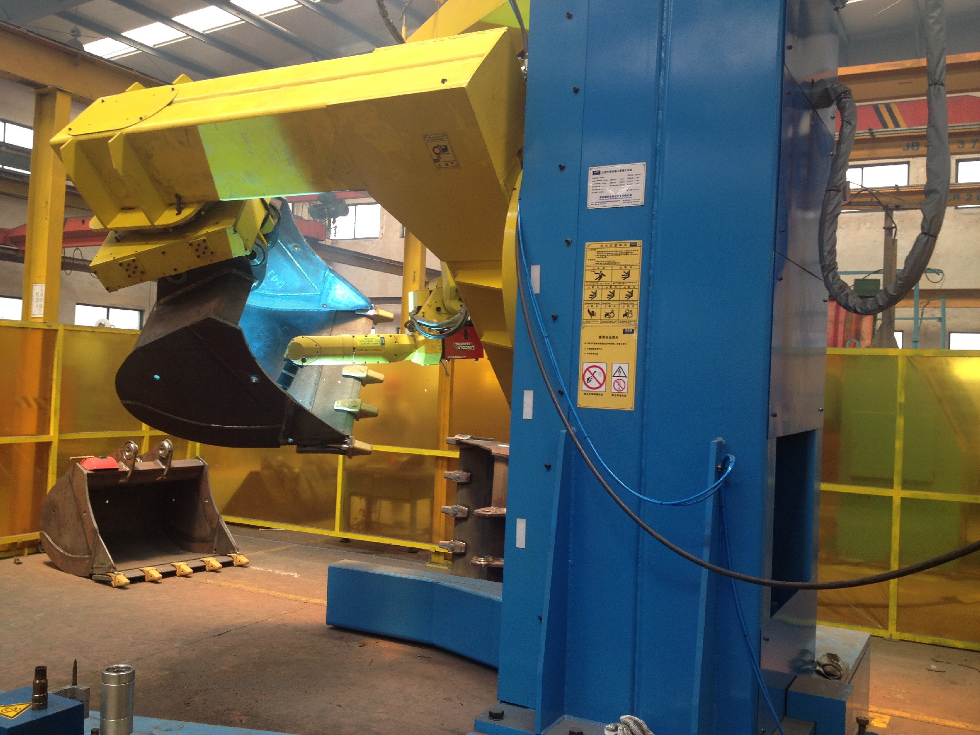 挖斗大組焊接機器人工作站采用10軸聯(lián)動機器人。這種工作站的設(shè)計不僅擴展了機器人的工作空間,還顯著提高了系統(tǒng)的柔性,能夠適應復雜多變的焊接需求。