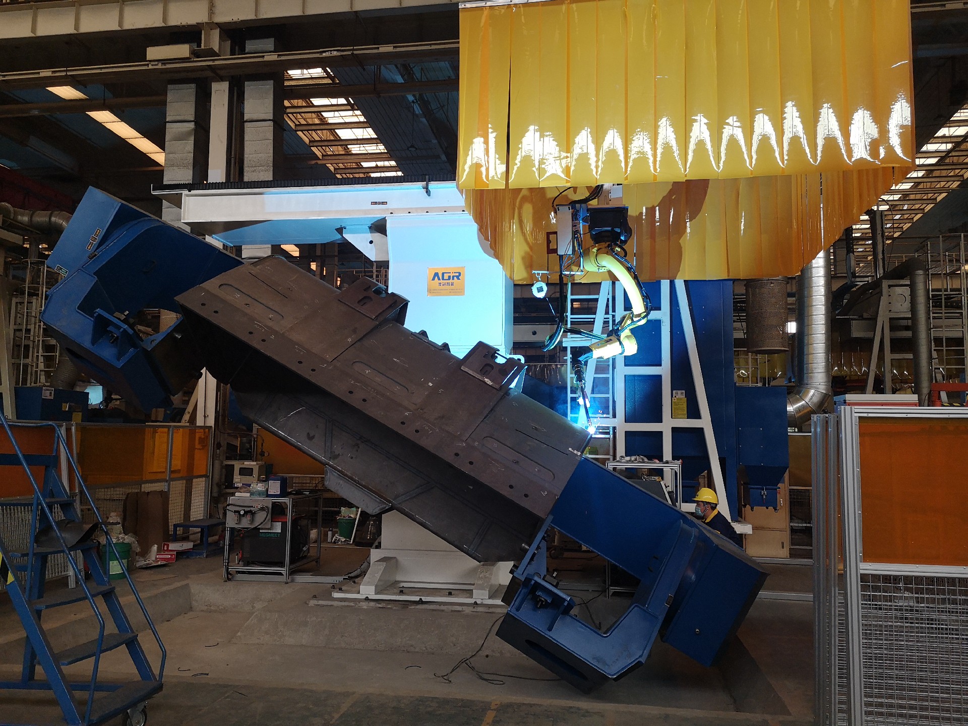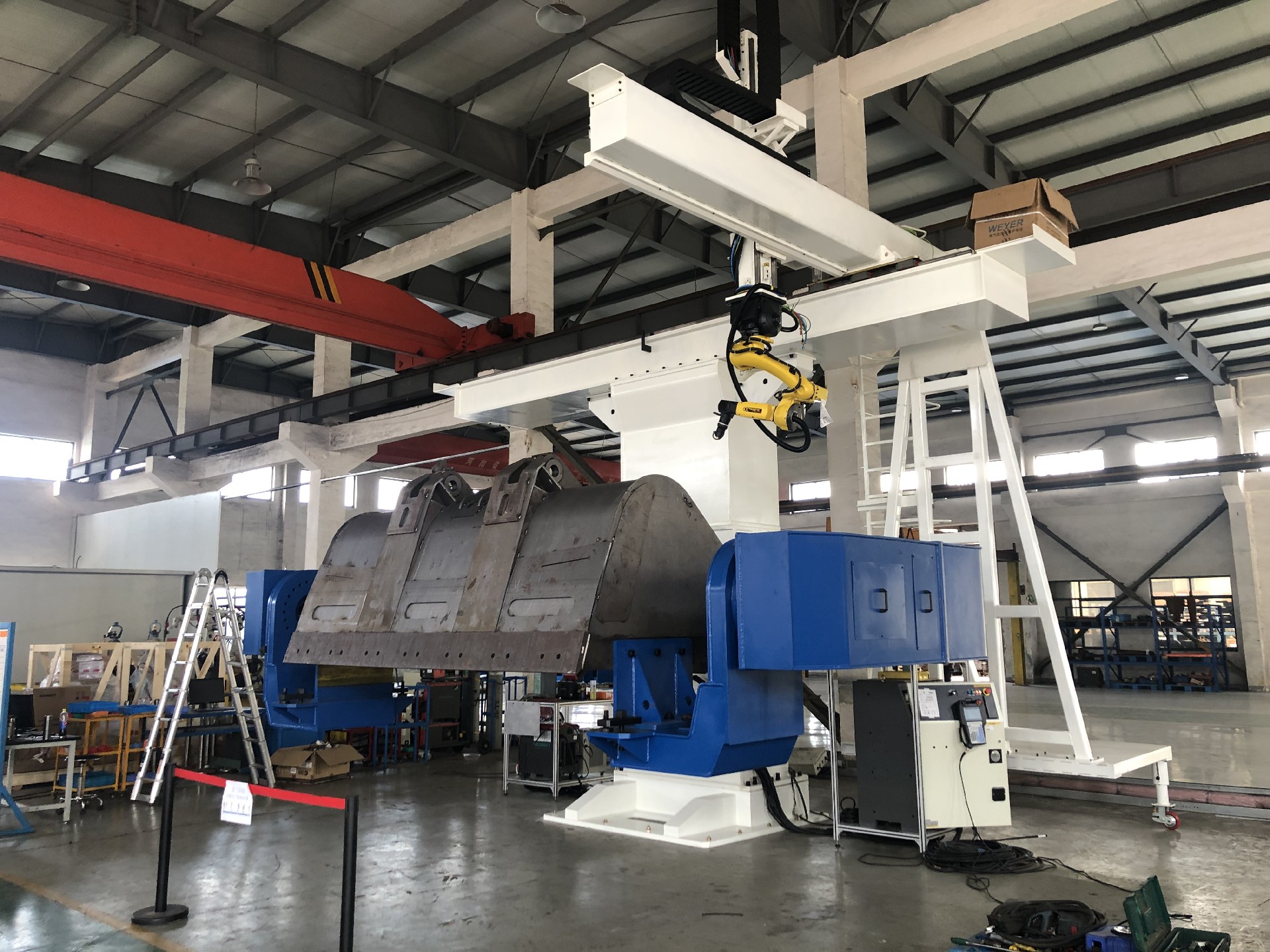 裝載機鏟斗焊接機器人工作站,采用11軸聯(lián)動機器人焊接系統(tǒng)。這種工作站的設(shè)計不僅優(yōu)化了空間利用,還顯著提高了生產(chǎn)效率和焊接質(zhì)量。