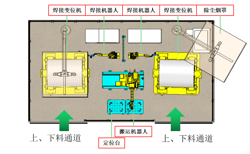 工作站包含雙工位,由兩臺焊接機(jī)器人分別對應(yīng)每個(gè)工位的焊接任務(wù)。焊接的是兩種產(chǎn)品,搬運(yùn)機(jī)器人負(fù)責(zé)自動拼點(diǎn)任務(wù)。