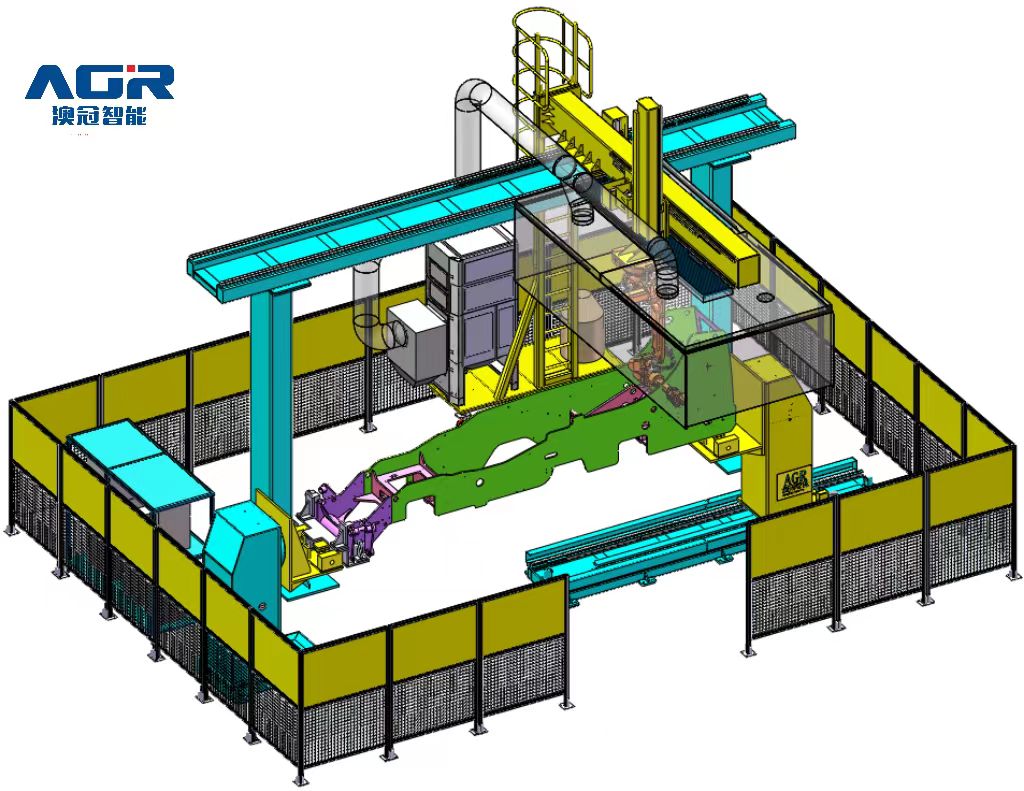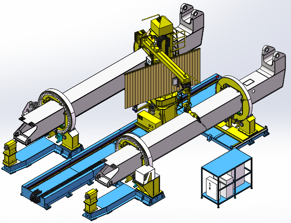 5機(jī)聯(lián)動(dòng)機(jī)器人焊接系統(tǒng);變位機(jī)承載能力達(dá)到1噸,適用于多型號(hào)動(dòng)臂斗桿結(jié)構(gòu)件的焊接;反變形及夾緊定位一體化設(shè)計(jì)伺服夾具,與工件自 動(dòng)化柔性輸送系統(tǒng)配合,可實(shí)現(xiàn)多種型號(hào)工件的自動(dòng)裝夾。