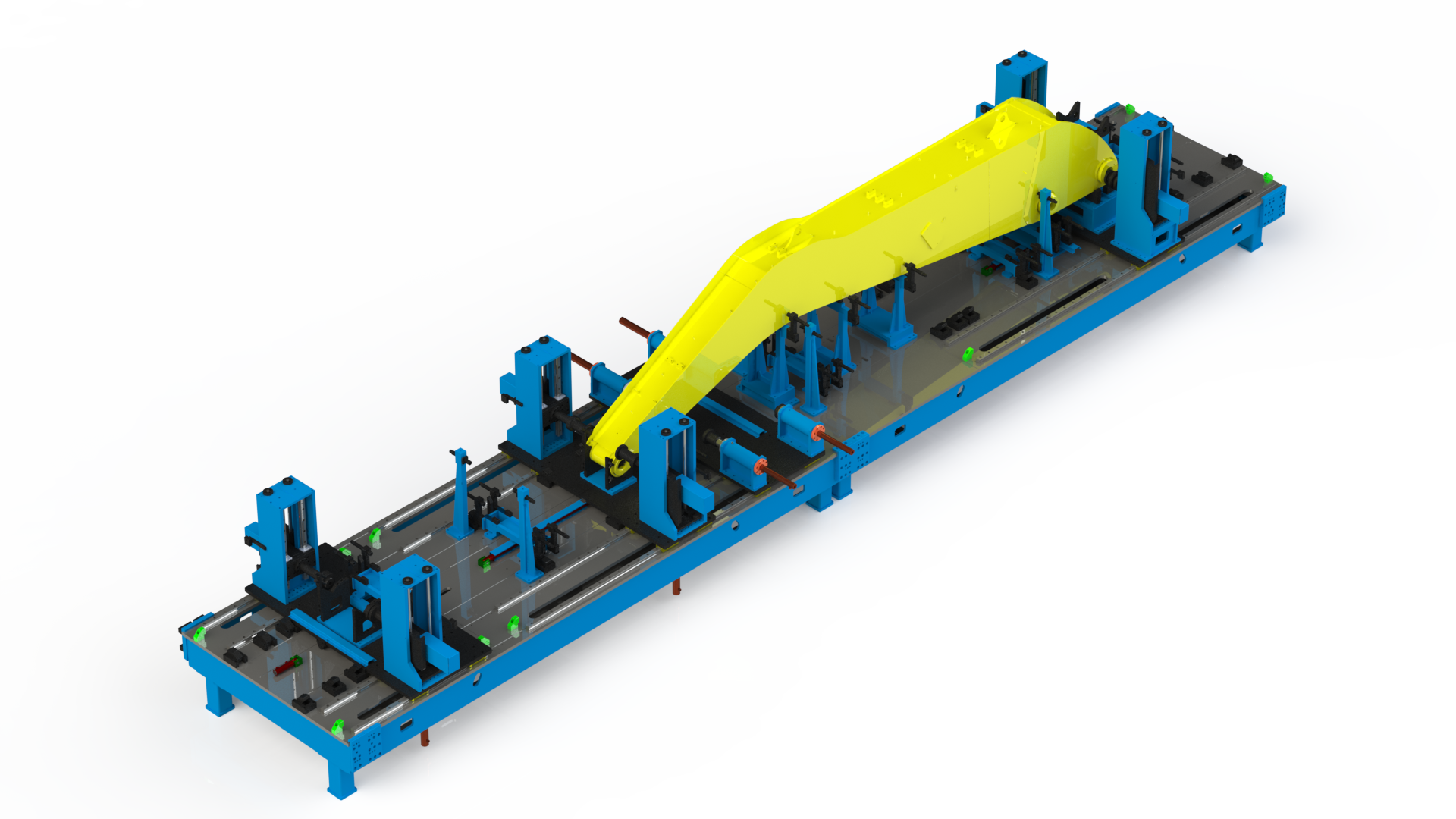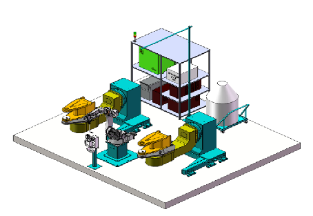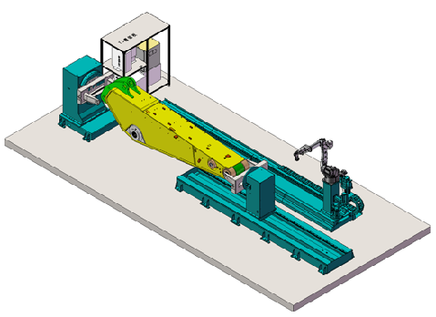 5機聯(lián)動機器人焊接系統(tǒng);變位機承載能力達到1噸,適用于多型號動臂斗桿結(jié)構(gòu)件的焊接;反變形及夾緊定位一體化設(shè)計伺服夾具,與工件自 動化柔性輸送系統(tǒng)配合,可實現(xiàn)多種型號工件的自動裝夾。